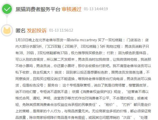 关注网友投诉道:“1月10日晚上在北京老佛爷百货一层stella mccartney 买了一双松糕鞋: 门店活动: 店内大部分衣服5折、门口5双鞋(2双靴子、3双松糕鞋)5折 购物过程: 男店员说靴子只有38、39码,3双松糕鞋都有37码,极力推荐我买银色款; 付款: 因为银色款是样品,可以从别的店调货,所以第二天发顺丰,男店员当时加我微信,让我微信转他钱,我说那不给小票吗,男店员说,你还要小票呀,那你去收银台付款吧。我不清楚老佛爷店员可以私下收款,自主权真大! 换货: 回到家以后还是想要粉色款,跟男店员发信息沟通,不同意换货,且购买过程没说过不能退换,等我给老佛爷服务台打完电话,男店员说可以换货,但是粉色没号; 服务台: 这个专柜是联营柜,说白了就是归商场管,楼管踢皮球,说不归他们管,专柜说不退就不退; 依据《消费者权益保护法》规定,“经营者不得以格式合同、通知、声明、店堂告示等方式作出对消费者不公平、不合理的规定,或者减轻、免除其损害消费者合法权益应当承担的民事责任”。“削价”、“打折”都只是定价上的策略,是商家的个人行为,与商品质量无关。无论商家定多低的价格,都必须保证商品质量,除非商家标明降价商品是本身有瑕疵,或因其它问题滞销的“次品”、“处理品”,而“处理品”因为消费者事先已从商家的介绍中知道其问题所在并能接受,才可以不退不换。对于商家的不公平、不合理格式的合同,如“减价商品概不退换”等,消费者可向消费者协会等部门投诉举报。”